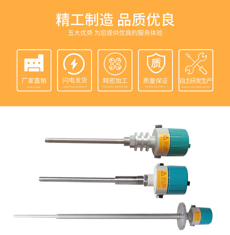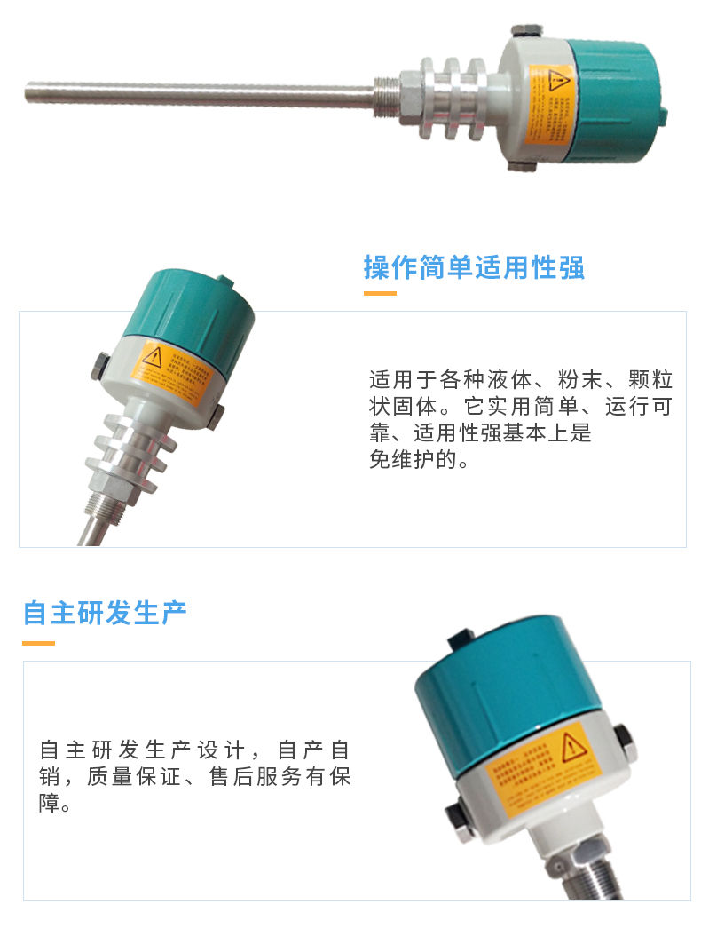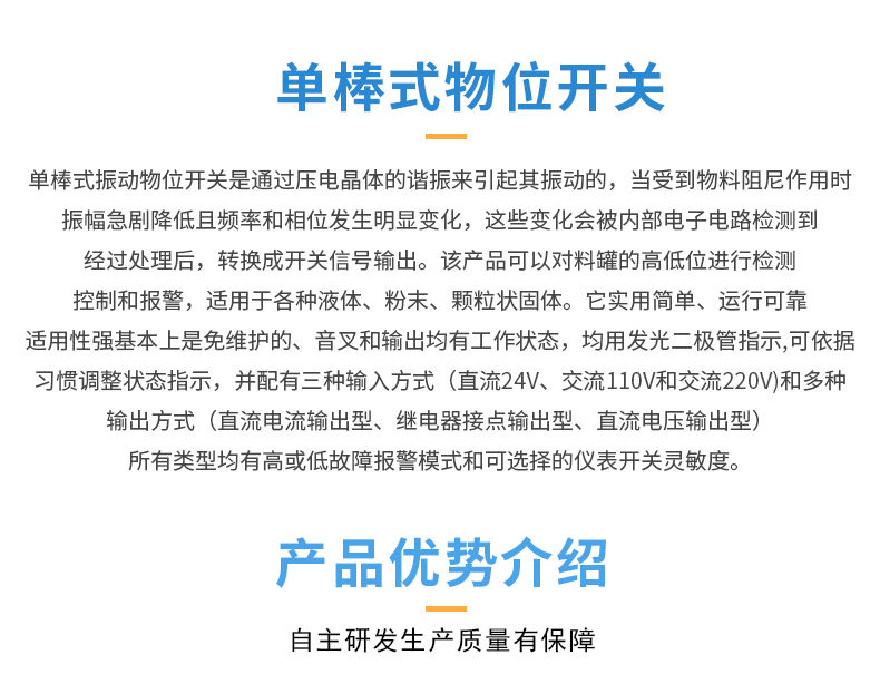 單棒式振動物位開關是通過壓電晶體的諧振來引起其振動的,當受到物料阻尼作用時,振幅急劇降低且頻率和相位發生明顯變化,這些變化會被內部電子電路檢測到,經過處理后,轉換成開關信號輸出。該產品可以對料罐的高低位進行檢測、控制和報警,適用于各種液體、粉末、顆粒狀固體。它實用簡單、運行可靠、適用性強基本上是免維護的、音叉和輸出均有工作狀態,均用發光二極管指示,可依據習慣調整狀態指示,并配有三種輸入方式(直流24V、交流110V和交流220V)和多種輸出方式(直流電流輸出型、繼電器接點輸出型、直流電壓輸出型)。所有類型均有高或低故障報警模式和可選擇的儀表開關靈敏度。