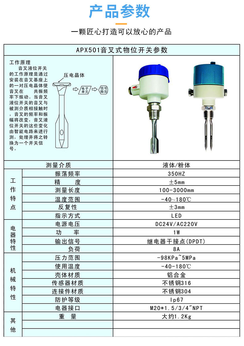 音叉式振動物位開關是通過壓電晶體的諧振來引起其振動的,當受到物料阻尼作用時,振幅急劇降低且頻率和相位發生明顯變化,這些變化會被內部電子電路檢測到,經過處理后,轉換成開關信號輸出。該產品可以對料罐的高低位進行檢測、控制和報警,適用于各種液體、粉末、顆粒狀固體。它實用簡單、運行可靠、適用性強基本上是免維護的、音叉和輸出均有工作狀態,均用發光二極管指示,可依據習慣調整狀態指示,并配有三種輸入方式(直流24V、交流110V和交流220V)和多種輸出方式(直流電流輸出型、繼電器接點輸出型、直流電壓輸出型)。所有類型均有高或低故障報警模式和可選擇的儀表開關靈敏度。