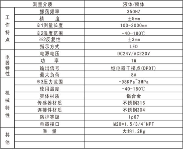 該產品可以對料罐的高低位進行檢測、控制和報警,適用于各種液體、粉末、顆粒狀固體。它實用簡單、運行可靠、適用性強基本上是免維護的、音叉和輸出均有工作狀態,均用發光二極管指示,可依據習慣調整狀態指示,并配有三種輸入方式(直流24V、交流110V和交流220V)和多種輸出方式(直流電流輸出型、繼電器接點輸出型、直流電壓輸出型)。所有類型均有高或低故障報警模式和可選擇的儀表開關靈敏度。
